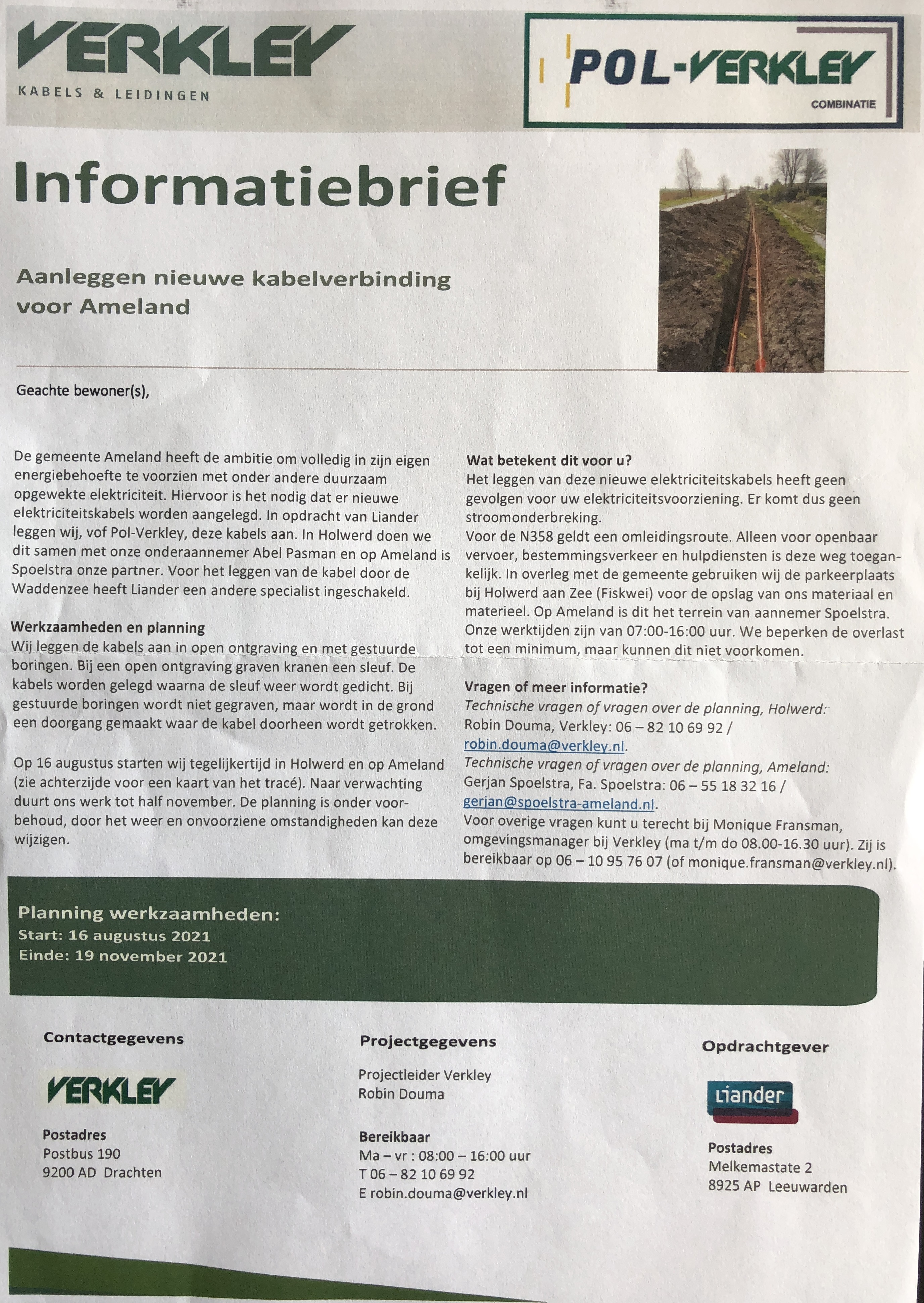 Het werk moet veilig kunnen gebeuren en geen onnodige hinder opleveren. Liander treft daarom voorzieningen om te zorgen dat fietsers en wandelaars langs de dijken zo min mogelijk gehinderd worden. Langs de provinciale wegen zorgt Liander in overleg met de provincie voor passende verkeersmaatregelen die een veilige doorstroming van het verkeer beogen. Op de plekken waar we inritten naar woningen, bedrijven of landbouwpercelen kruisen, gaan we tijdig in overleg met de betrokkenen om te zorgen dat de overlast beperkt kan blijven. Ook zorgt Liander er in overleg met de wadlooporganisaties voor dat de wadlooptochten naar Ameland op een veilige manier doorgang kunnen vinden.