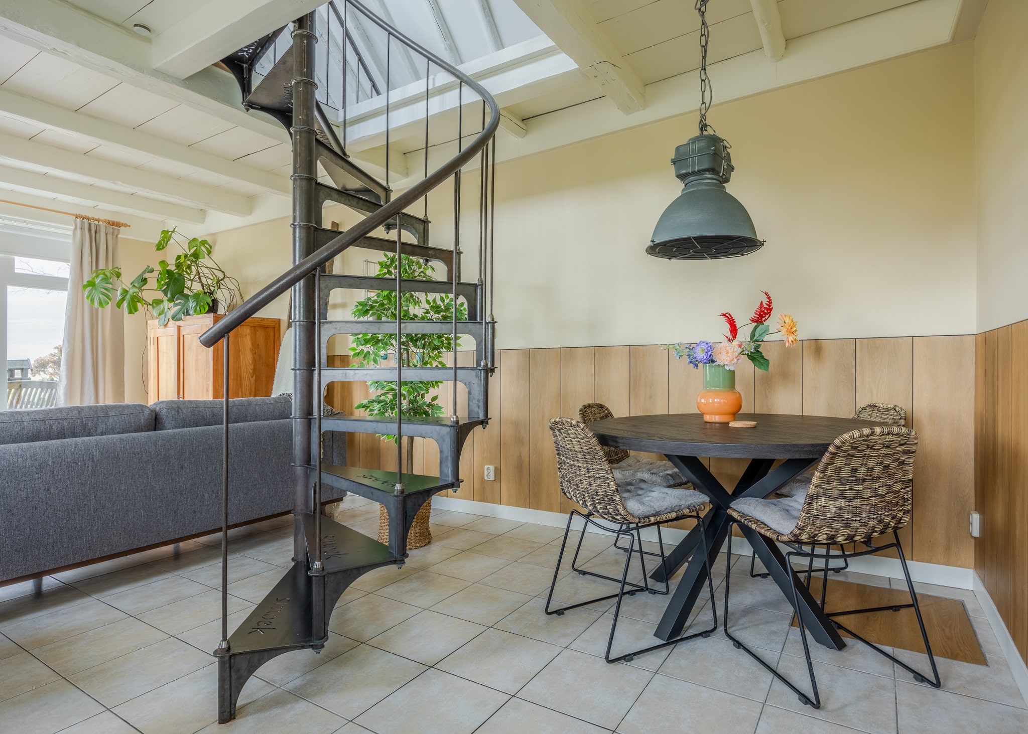De unieke trap naar de verdieping is gemaakt door Ensel staalkonstrukties uit Dokkum, en heeft als bijzonderheid dat de naam van ons huisje in elke trede staat. Dit geeft een heel bijzonder lichteffect wanneer het licht op de verdieping aan is en zo de uitsneden in de treden op de vloer projecteert.