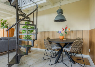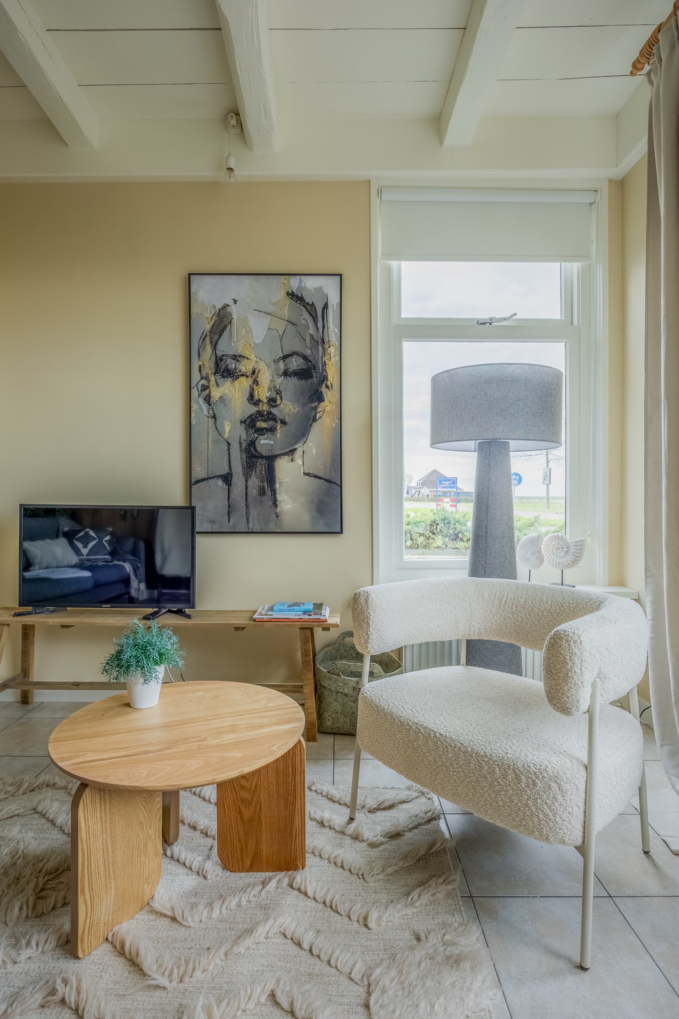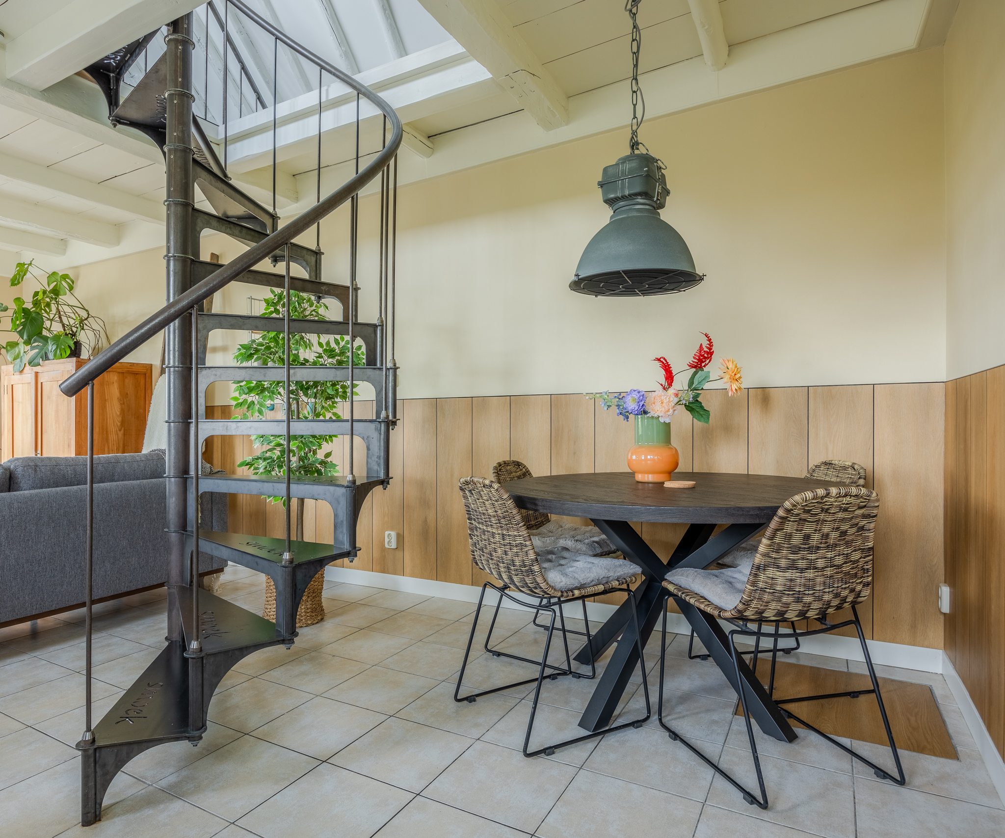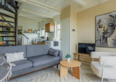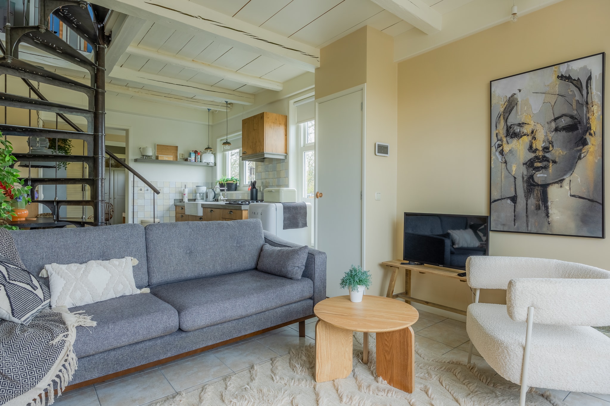 In de keuken en bijkeuken kunt u gebruik maken van de vaatwasser, wasmachine en wasdroger. Via de bijzondere trap komt u op de verdieping, waar een kleine en gezellige slaapkamer met een tweepersoonsbed is gemaakt. In de achterste slaapkamer met het karakteristieke balkenplafond staat het tweede tweepersoonsbed.